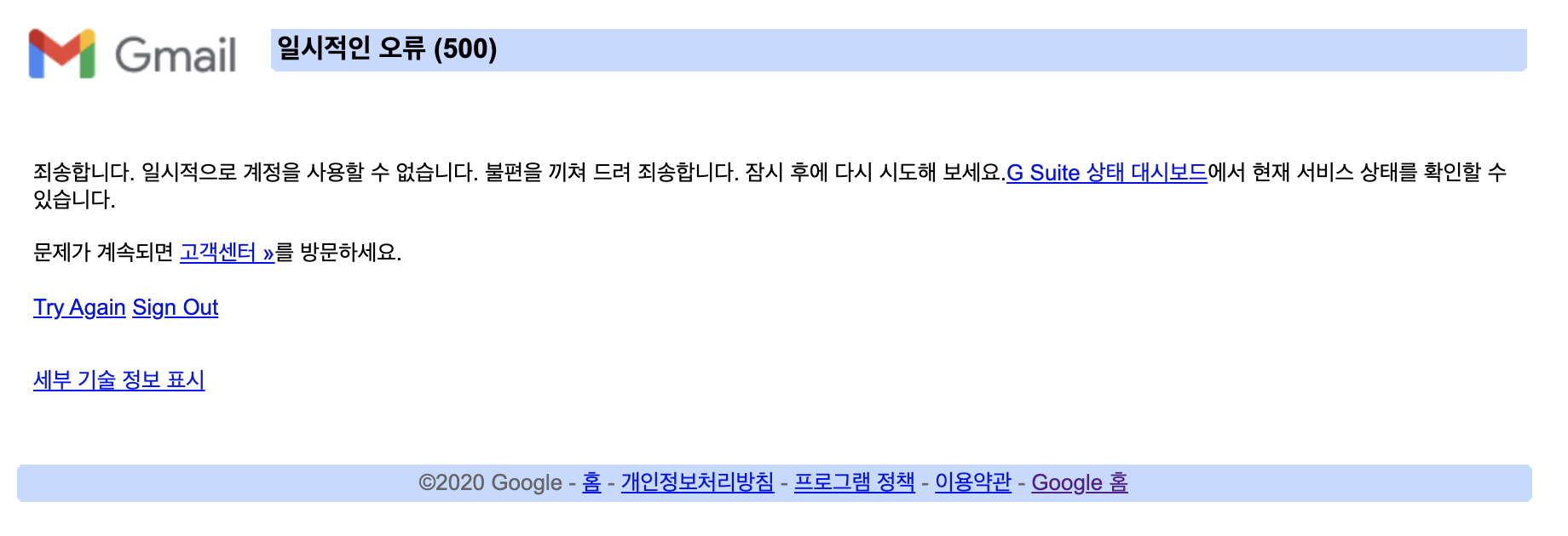 500 일시적인 오류 라는 문구와함께 지메일은 로그인이 불가능하다.