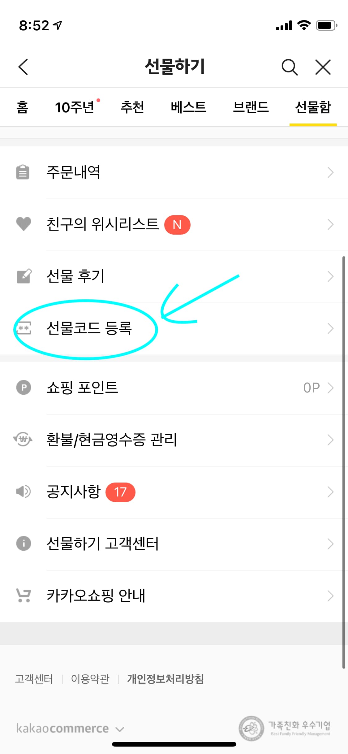 선물함 에서 선물코드 등록 메뉴를 들어간다.
