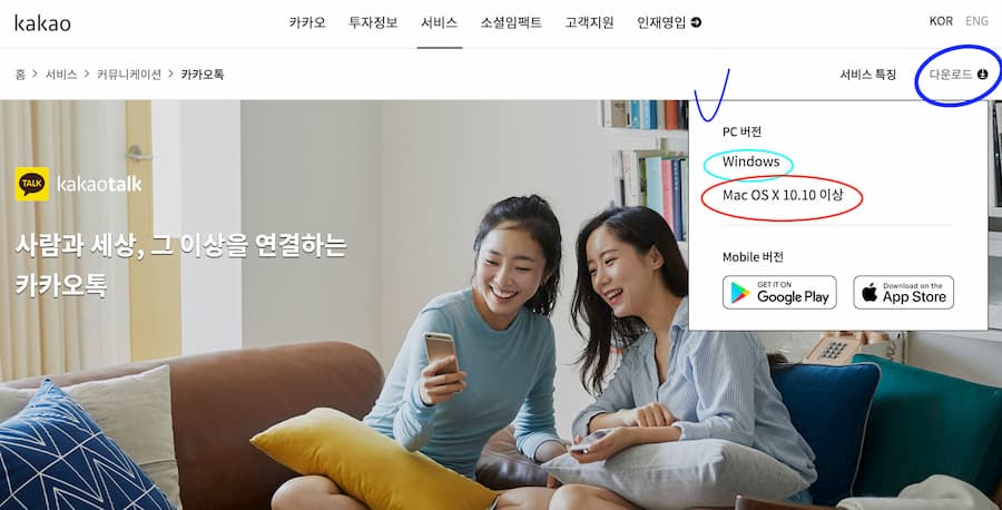 맥 앱스토어로 연결되어 다운로드 가능하며, 윈도우 사용자는 카카오톡 홈페이지에서 윈도우 버튼 클릭시 바로 설치 파일로 다운로드 받아진다.