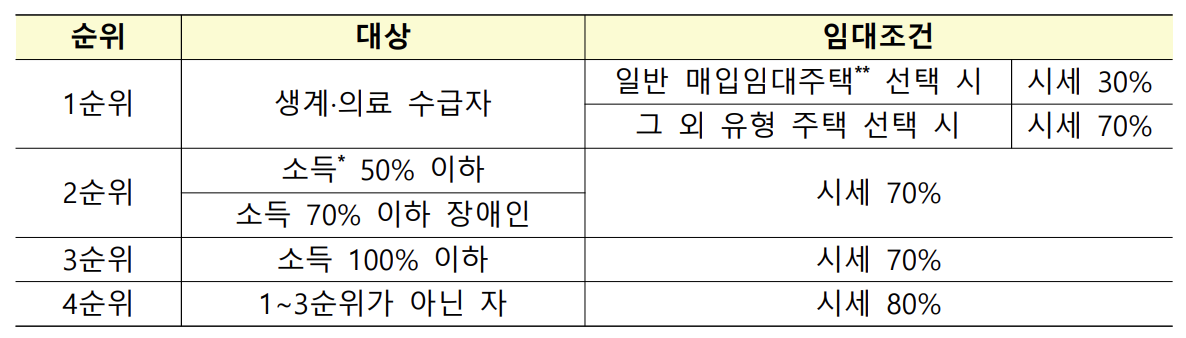 입주자격(순위)에 따라 시중 시세의 70~80% 수준의 임대보증금 및 임대료