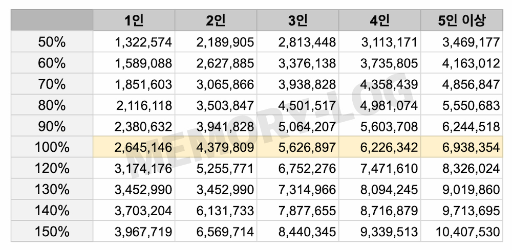 1인가구 부터 5인가구까지 50% ~ 100% ~ 150% 구간까지 한번에 정리해보았다.