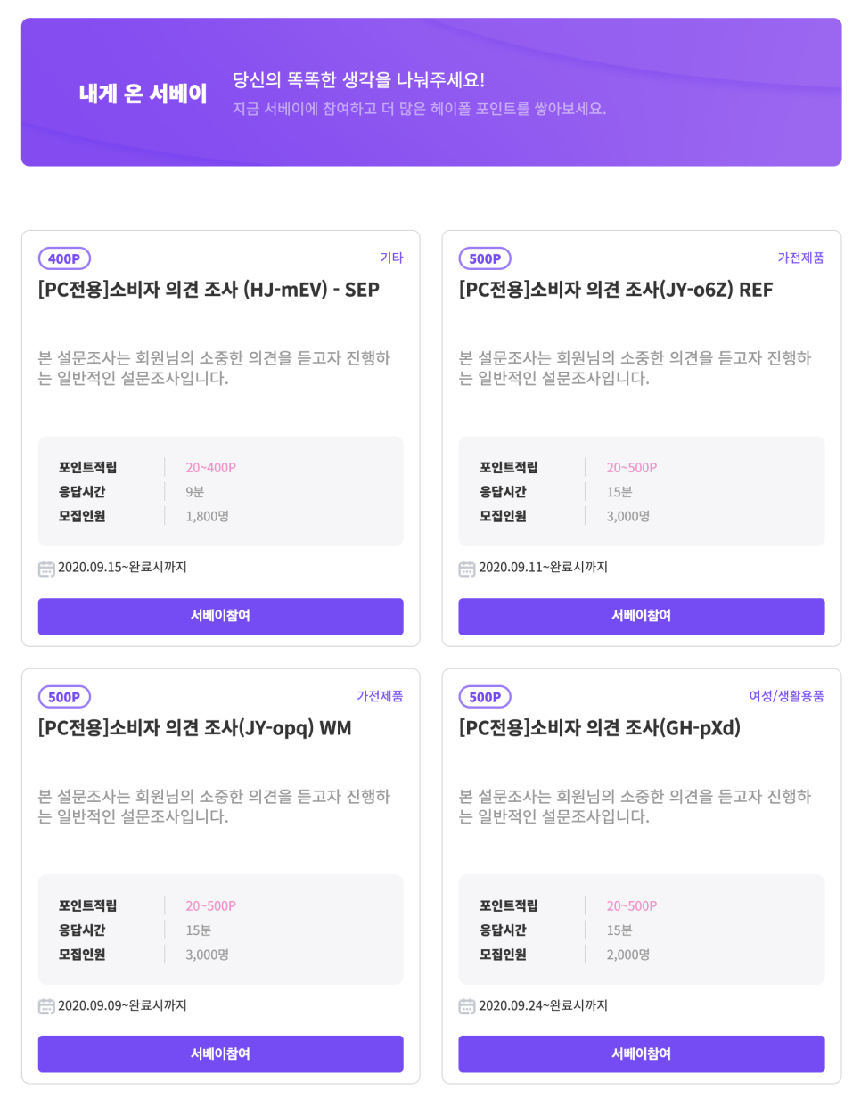 천원이상 금액이 높은 설문은 시간이 30분 정도 소요되는 편이다.