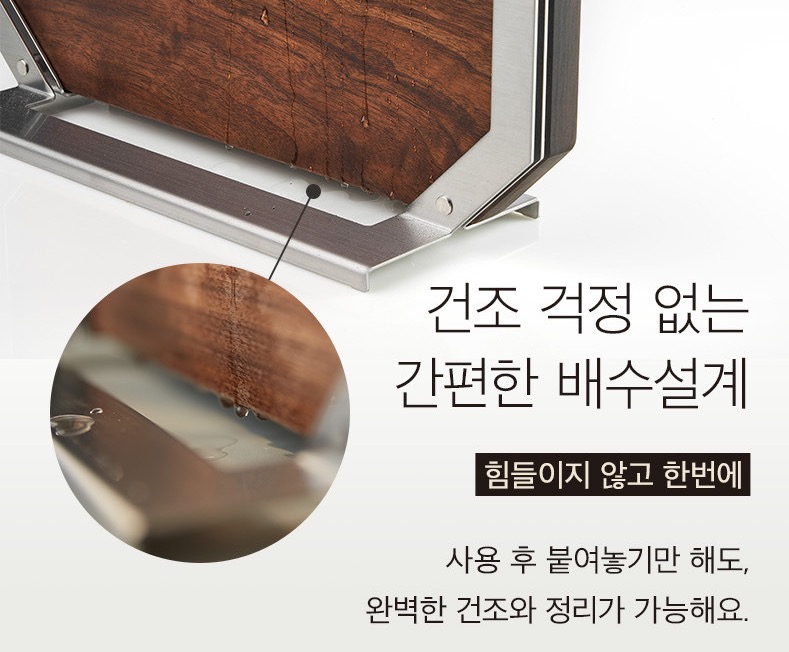 최고급 북미산 FAS 등급 월넛 목재를 사용하며 위생, 건조, 안전을 고려해 스테인레스 프레임을 더해 사용과 보관이 모두 용이하도록 한 제품이다.