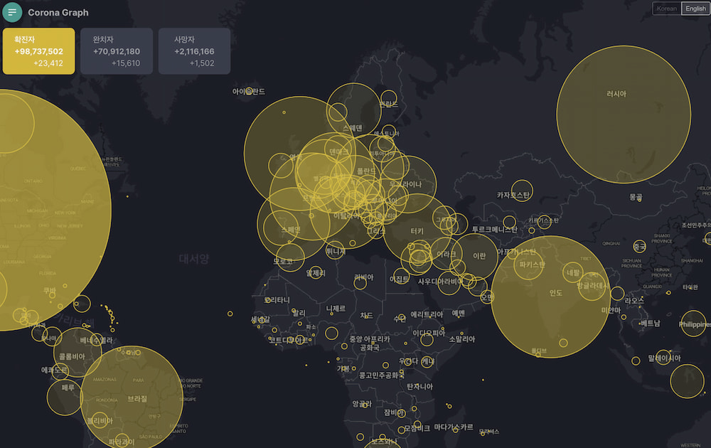 전세계 나라별 코로나 현황을 지도로 한눈에 볼 수 있다.