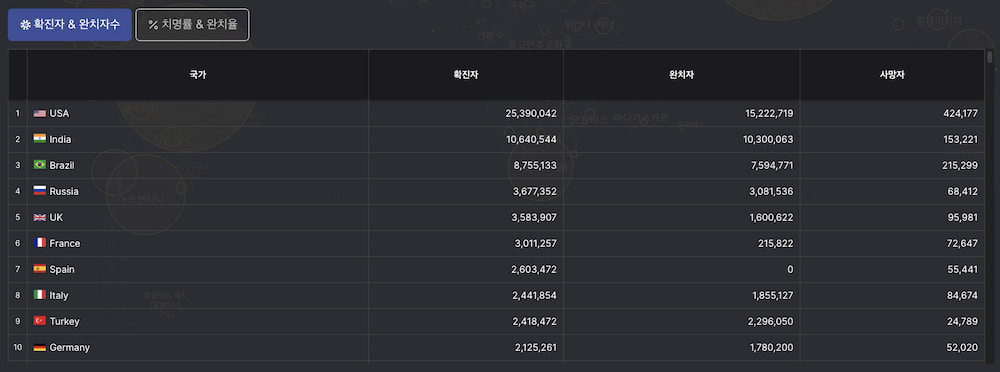 나라별 국가별 확진자와 치명률, 완치율, 100만명당 발생 수를 확인 할 수 있다.