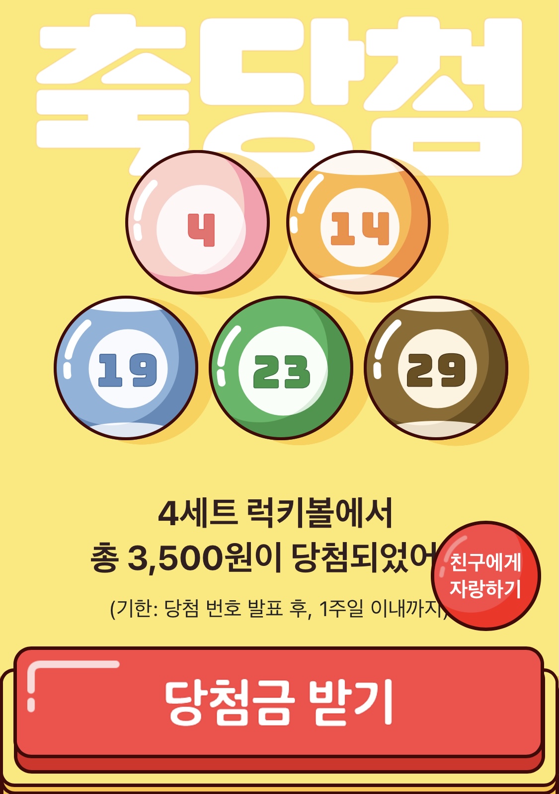 럭키볼은 친구한테 공유해서 하나씩 서로 로또 복권 처럼 더 생기는데 이게 다섯개가 쌓이면 500원을 바로 페이머니로 받을 수 있다.