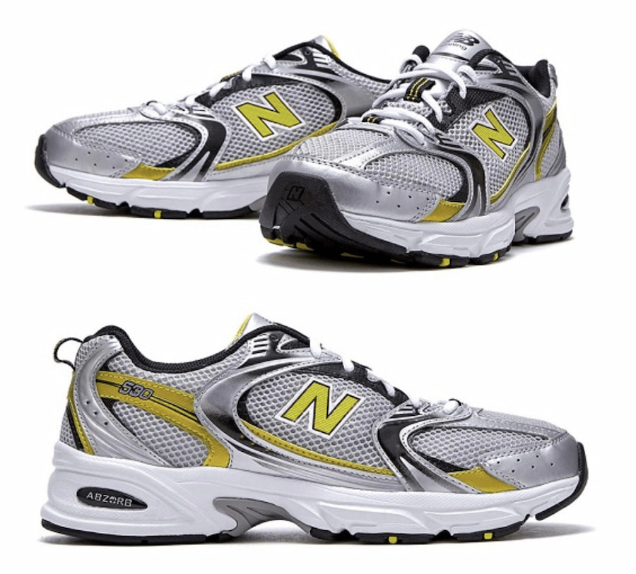 그레이, 블랙 베이스의 운동화에 부분적으로 옐로우 컬러가 가미되어 심플하면서도 세련되어 보이는 운동화다.