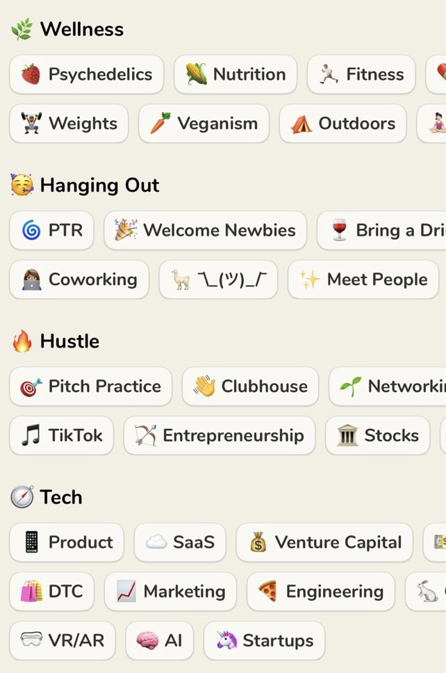 Wellness, Hanging Out, Hustle, Tech, Faith 카테고리 등에서 내가 관심있는 주제와 분야를 선택할 수 있다.