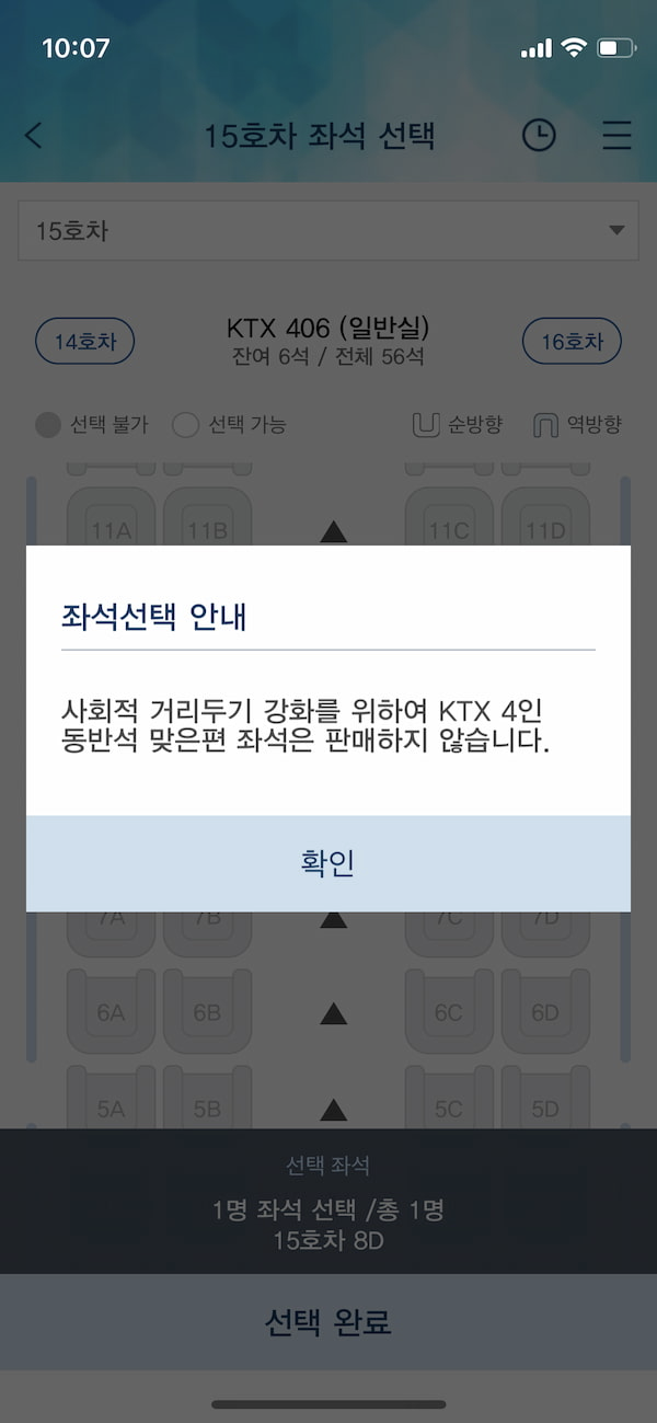 해당 좌석을 선택하면 사회적 거리두기 강화를 위하여 KTX 4인 동반석 맞은편 좌석은 판매하지 않습니다. 라는 알림 창이 뜬다.
