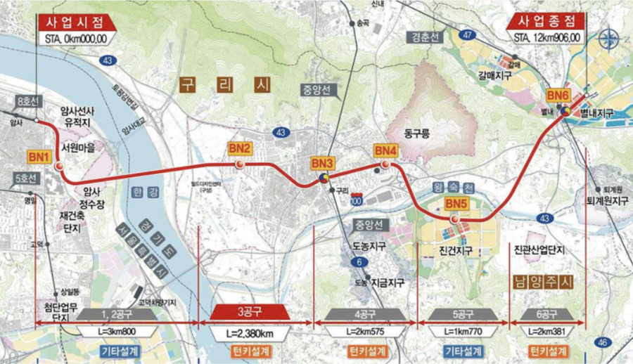 서울 지하철 2, 3, 5호선, 분당선과도 환승이 가능해지고 남양주·구리 지역에서 서울 잠실까지 가는 이동시간이 약 17분가량 단축될 예정이라 주목받고 있다.