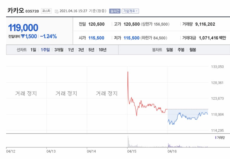 카카오는 액면가를 500원에서 100원으로 쪼갠 액면분 할 후 첫 거래일에 12만 5천원으로 종가를 마무리 했다. 장 초반에 18%까지 오르면서 13만원을 넘기도 했는데 외국인 매도세에 상승폭은 줄어들기도 했다.