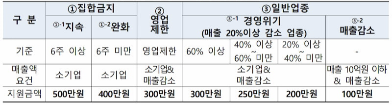 집합금지, 영업제한, 일반업종 기준에 따라 지원금액이 다르다. 아래 표를 참고하자.