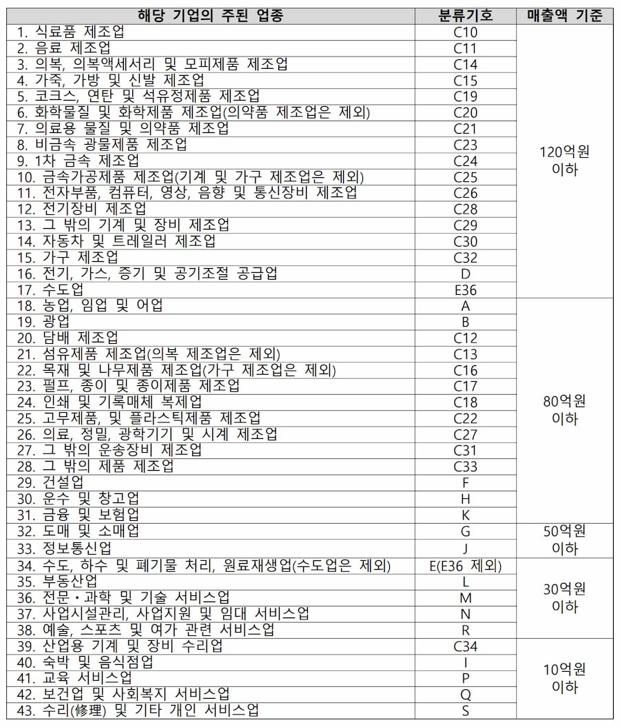 - ’20년 기준 매출액이 10~120억원 이하(음식‧숙박: 10억원, 도소매: 50, 제조: 120 등)