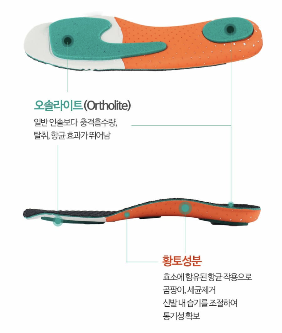 아치보정, 지압돌기, 일반 깔창에 비해서 충격 흡수량과 향균 탈취 기능이 강력한 오솔라이트 제품이다.