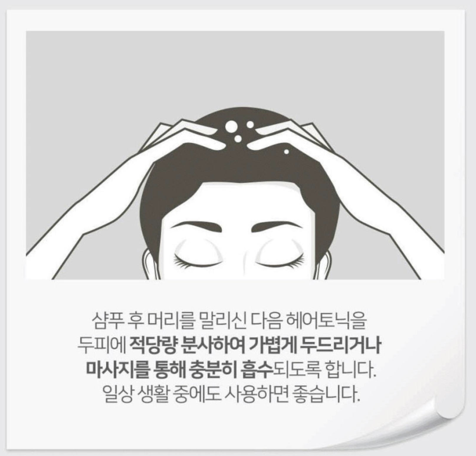 샴푸 후에 머리를 말린 다음에 헤어 토닉을 두피에 적당량 분사해서 가볍게 두드리거나 마사지를 통해 충분히 흡수되도록 한다. 일상 생활중에서도 사용하면 더욱 효과가 좋다.