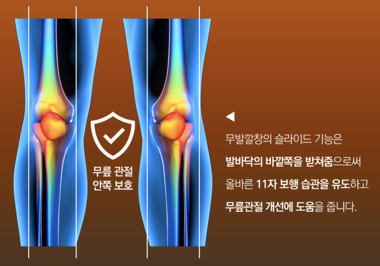 두발 착지시에 수평을 유지하되 보행시 각도를 변화시키는 간헐적인 각도변화의 특성을 통해 안쪽 무릎 보호기능을 극대화 하였다.