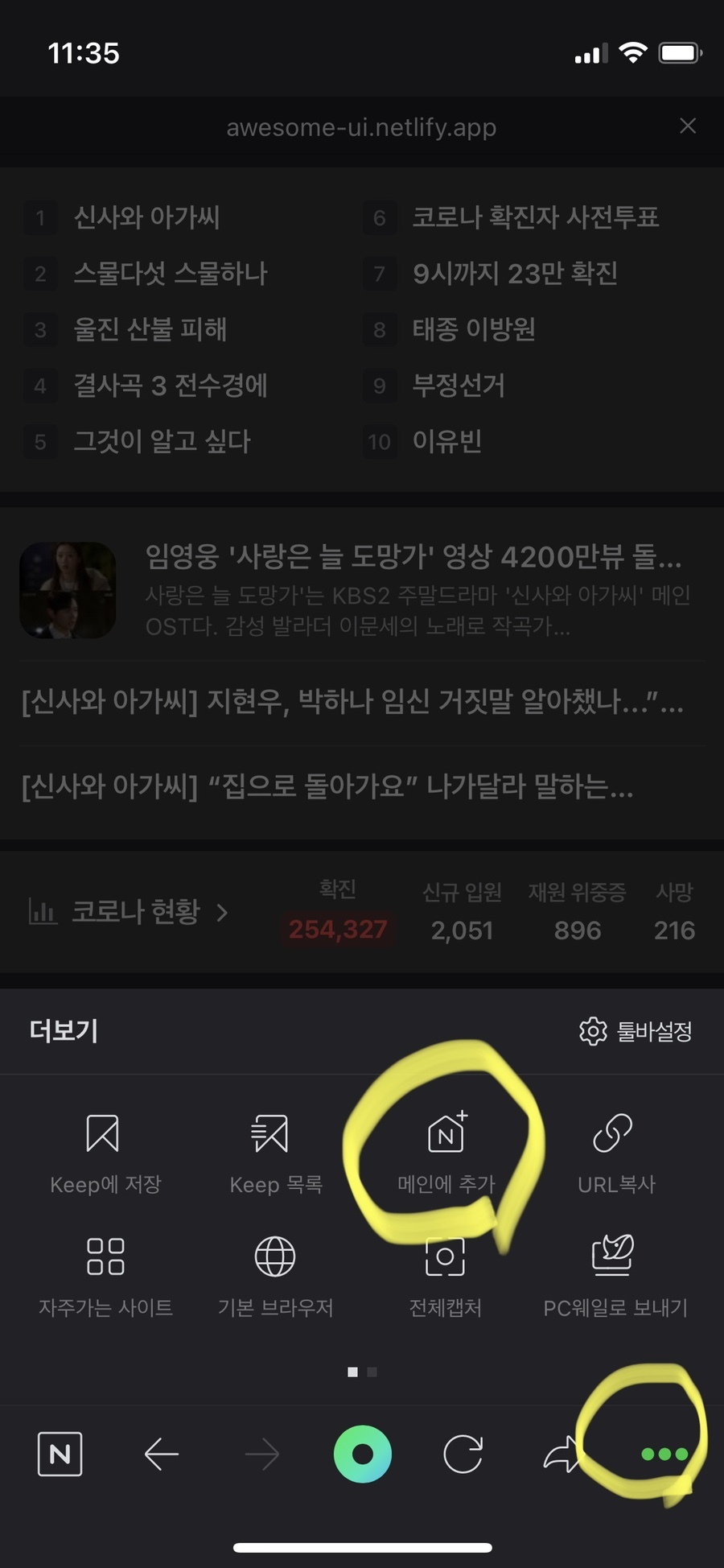 오른쪽 하단의 점세개 아이콘을 눌러 네이버 메인에 추가하기를 누른다.