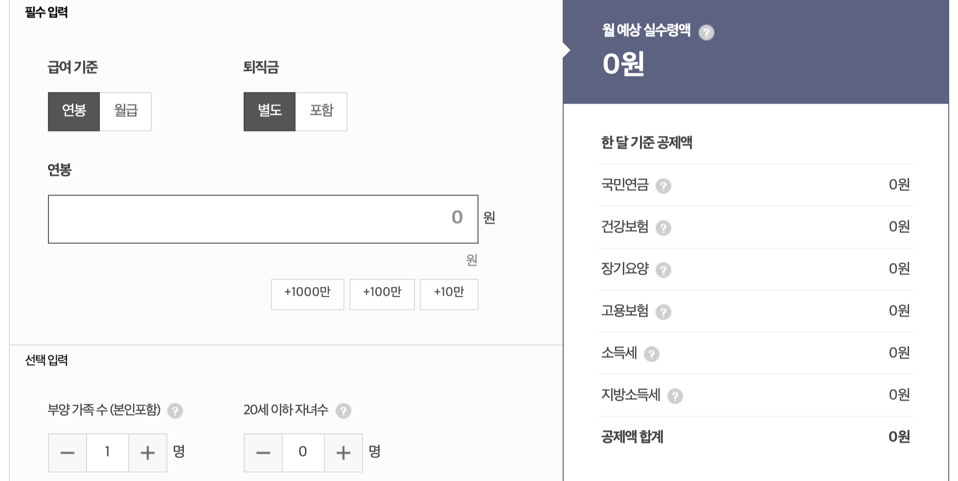 사람인 연봉계산기도 네이버와 비슷하게 부양 가족수와 자녀수에 따라 조회해볼수 있고 금액 단위 추가 버튼이 있어 좀더 편하게 조회 해볼 수 있다.