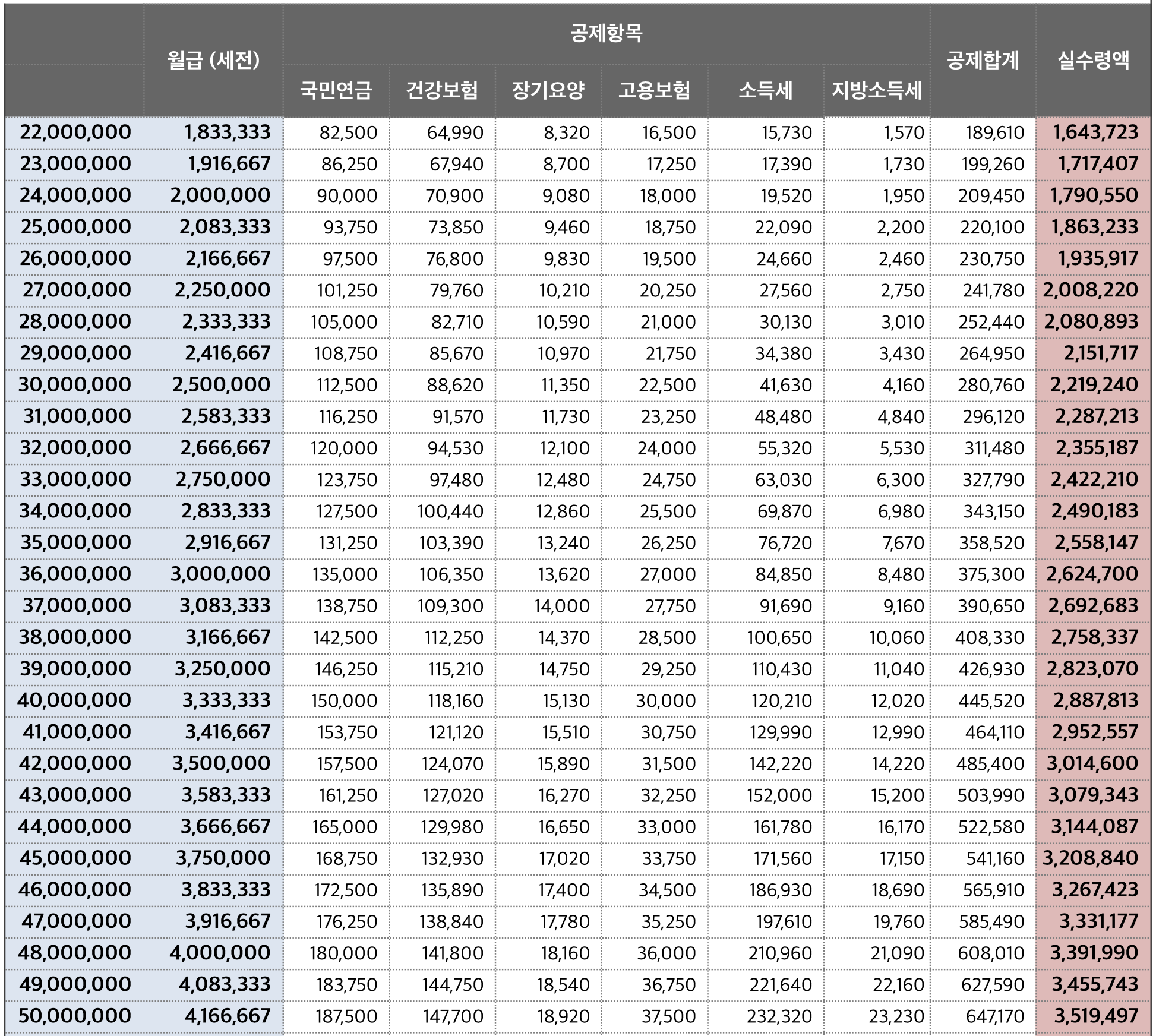 2022년 연봉 실수령액표, 연봉 세후 월급, 연봉 세금액, 국민연금, 건강보험료, 장기용양, 고용보험, 소득세, 지방소득세 공제액