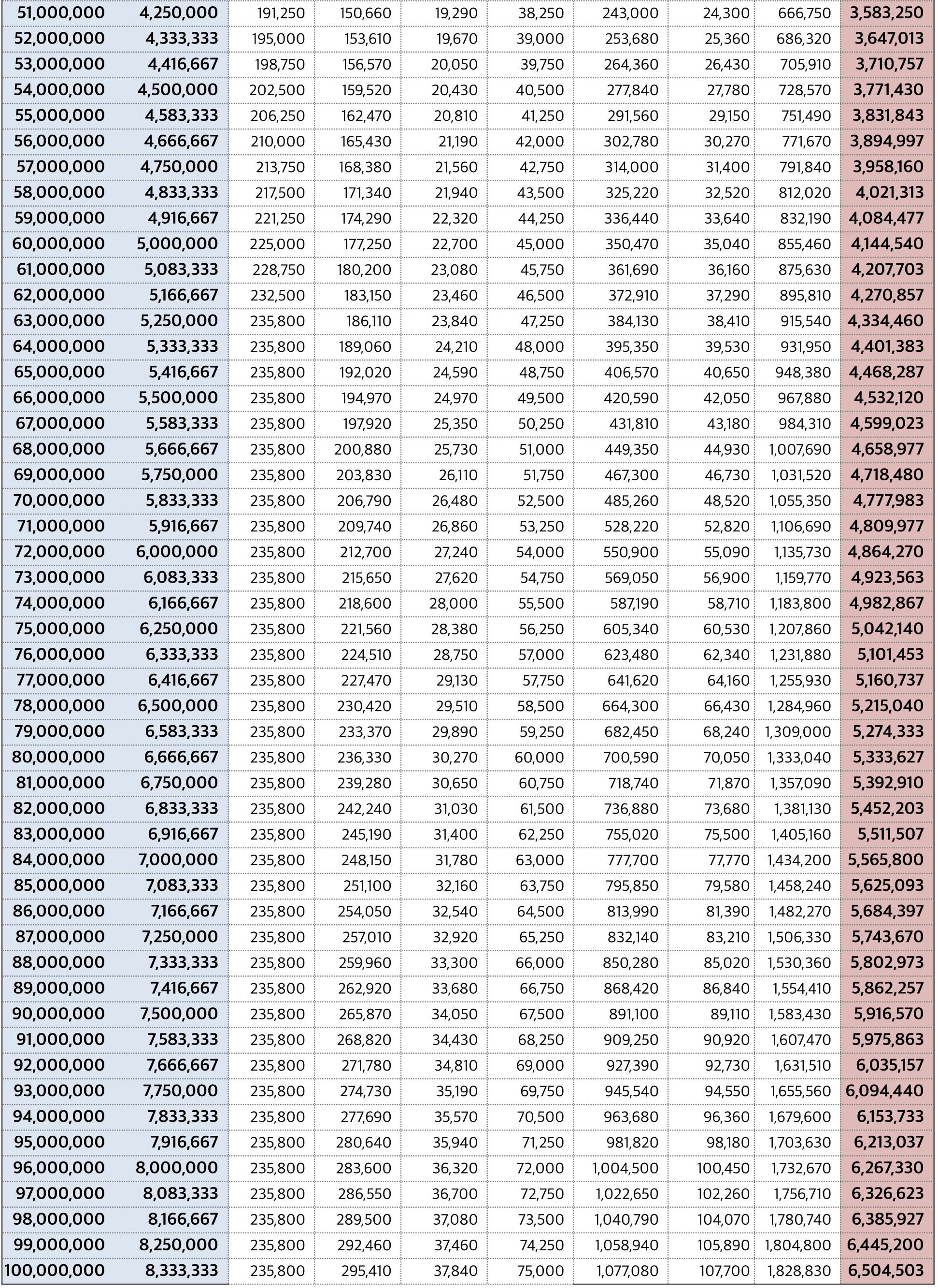 2023년 연봉별 구간별 실수령액과 세금 공제액 표