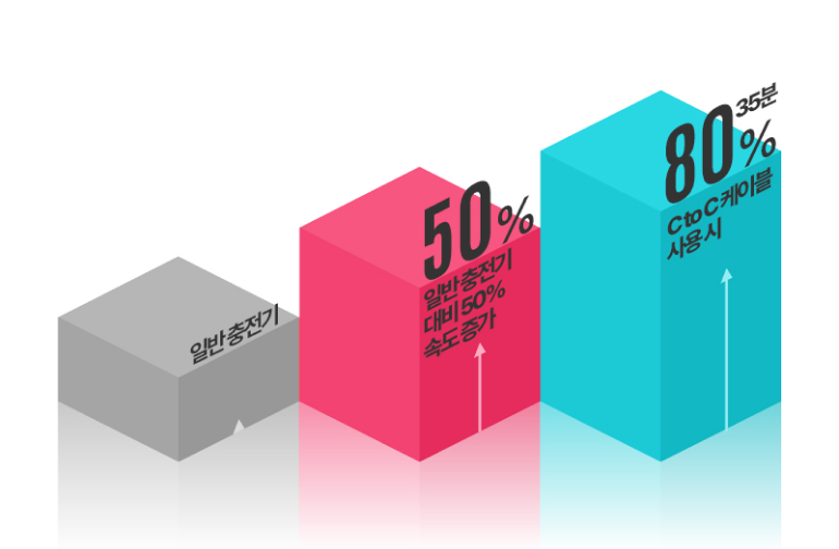 일반 충전기 대비 50% 빠른 충전 속도를 경험하실 수 있습니다. C to C 케이블 사용의 경우 호환 기기가 35분 만에 80%가 충전됩니다.