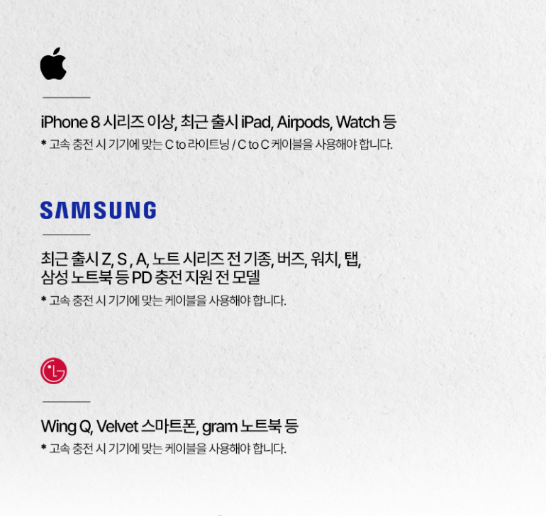 - Apple - iPhone 8 시리즈 이상, 최근 출시 iPad, Airpods, Watch 등 * 고속 충전 시 기기에 맞는 C to 라이트닝/C to C 케이블을 사용해야 합니다.