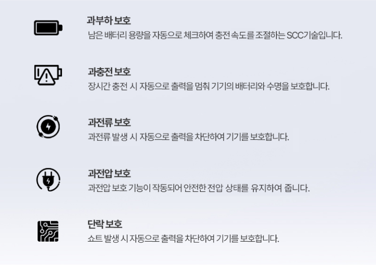 과부하 보호 남은 배터리 용량을 자동으로 체크하여 충전 속도를 조절하는 SCC기술입니다.
