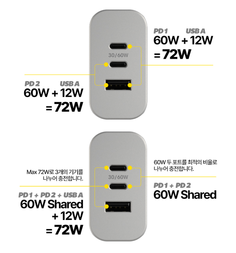- PD1(C타입) + PD2(C타입) + USB A(12W) : 60W Shared + 12W = 72W Max 72W로 3개의 기기를 나누어 충전합니다.