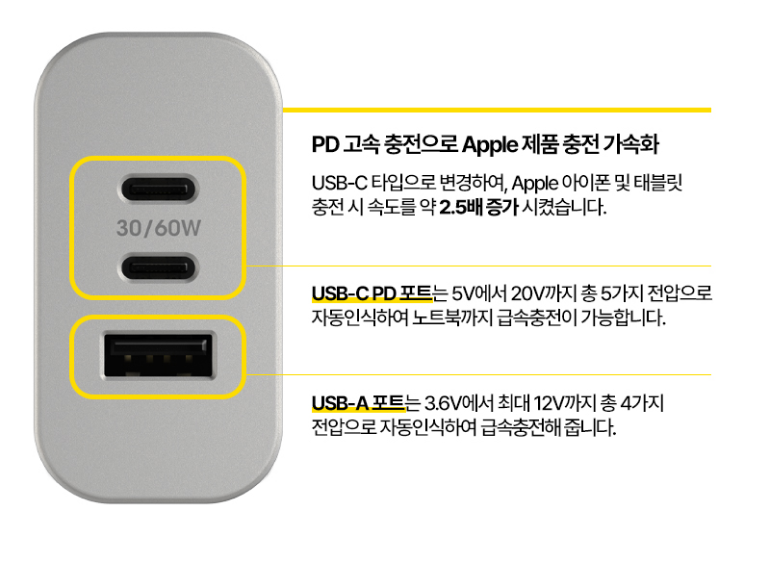 - PD1(C타입/60W) + USB A(12W) = 72W