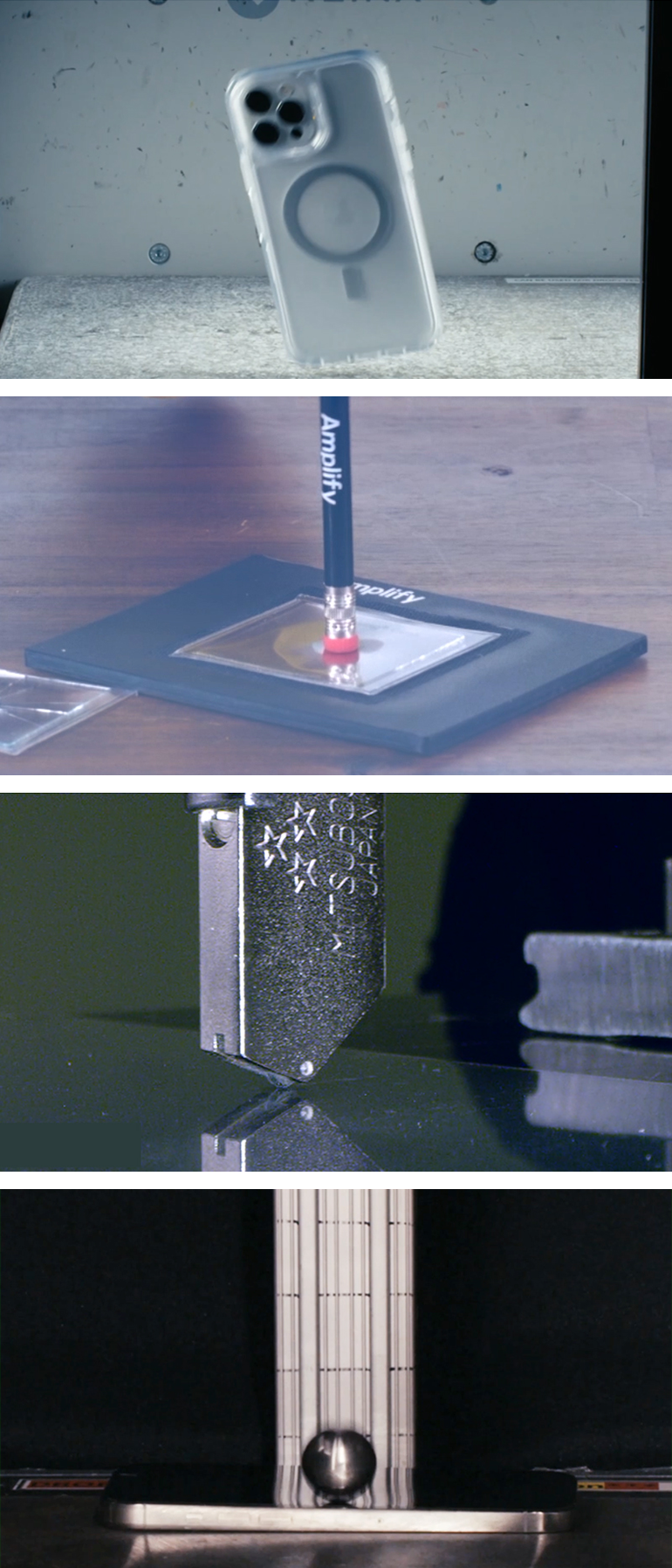 쇠구슬, 연필, 스크래치, 텀블 등의 테스트를 통해 검증했어요. 6피트(1.82m) 높이에서 30개의 샘플을 떨어뜨리는 드롭+ 테스트에 통과했어요.