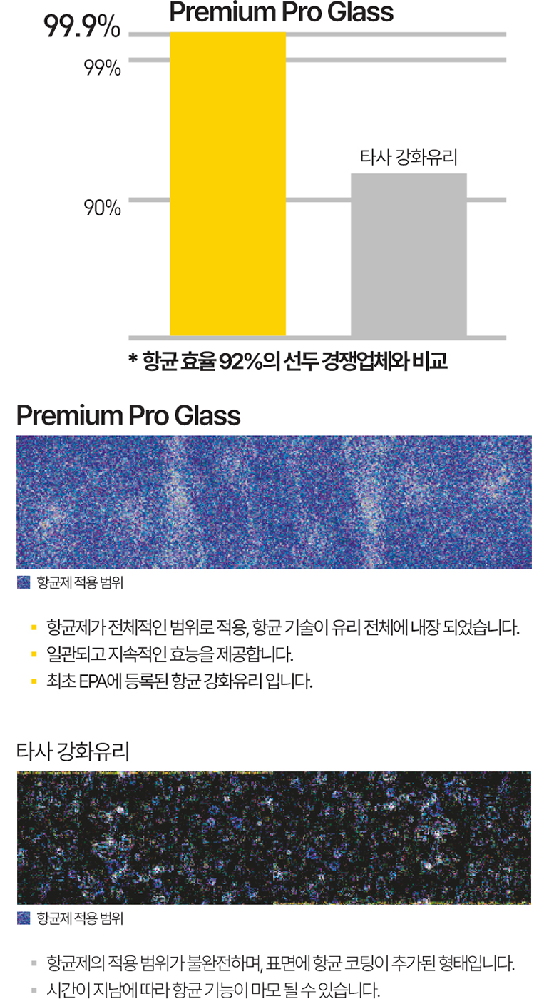 항균제 적용 범위 비교프리미엄 프로 글래스- 항균제가 전체적인 범위로 적용, 항균 기술이 유리 전체에 내장되어 있습니다.