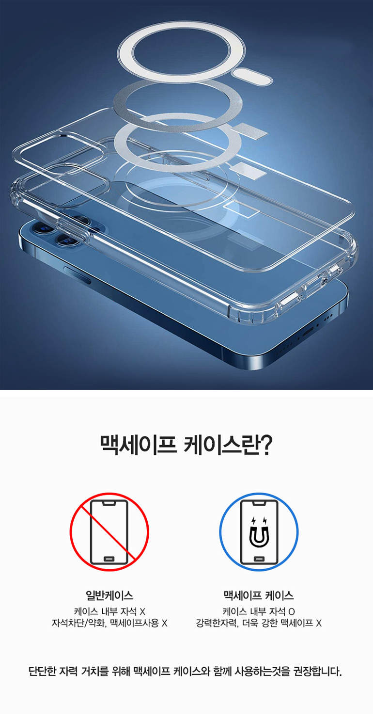 맥세이프 케이스란?일반케이스 : 케이스 내부 자석 불가능, 자석차단/약화, 맥세이프사용 불가능맥세이프 케이스 : 케이스 내부 자석 가능, 강력한 자력, 더욱 강한 맥세이프 불가능
