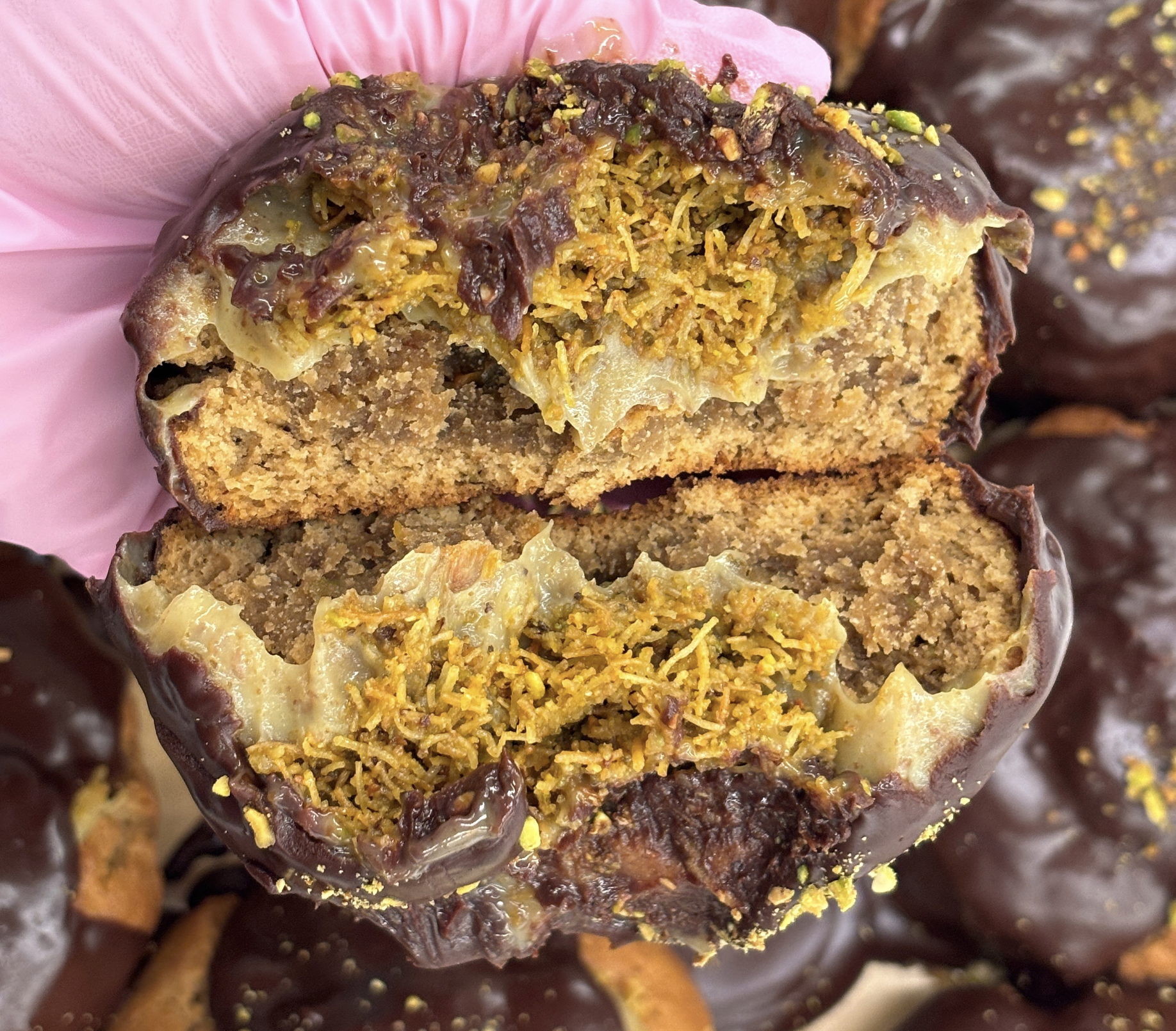 - 바삭함과 부드러움의 조화: 카다이프 면의 바삭한 식감과 초콜릿의 부드러운 질감이 어우러져 독특한 식감을 제공합니다.