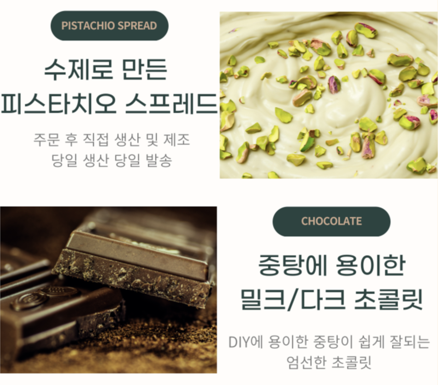 수제로 만든 피스타치오 스프레드와 중탕에 용이한 밀크/다크 초콜릿으로 간편하게 두바이 초콜릿을 만들 수 있는 키트를 활용해 보자.