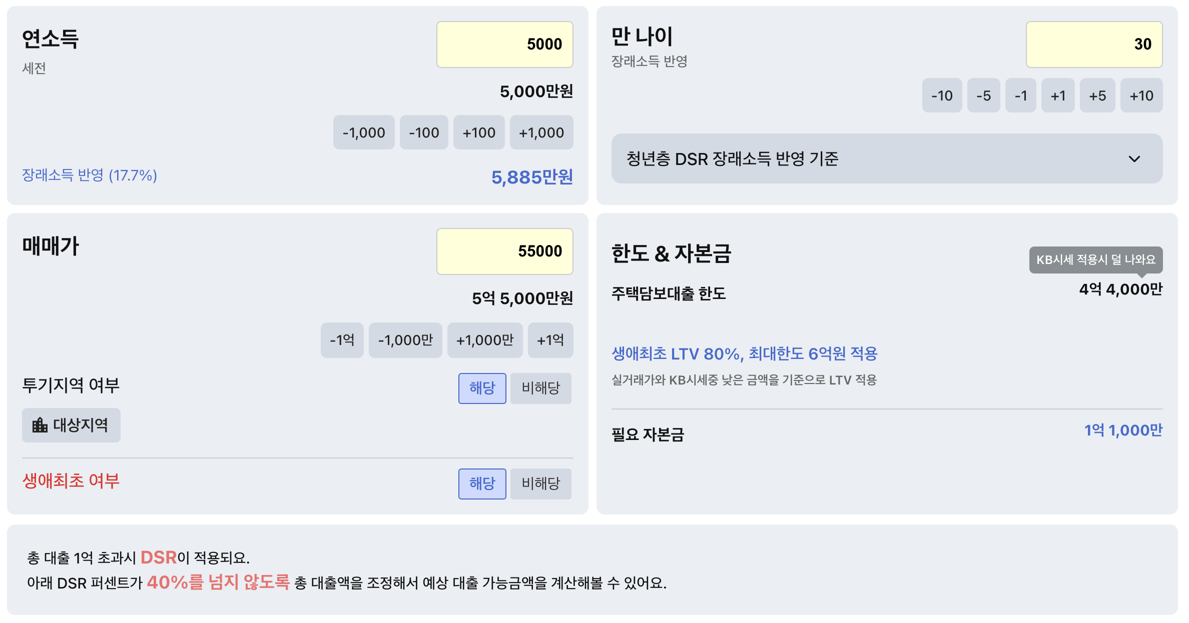 - 연소득: 세전 5,000만원 (장래소득 반영 5,885만원)