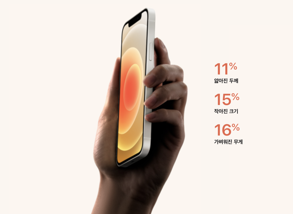 아이폰 11에 비해 두께는 11% 얇아지고, 크기는 15% 작아지고, 무게는 16% 가벼워 졌다고 한다.