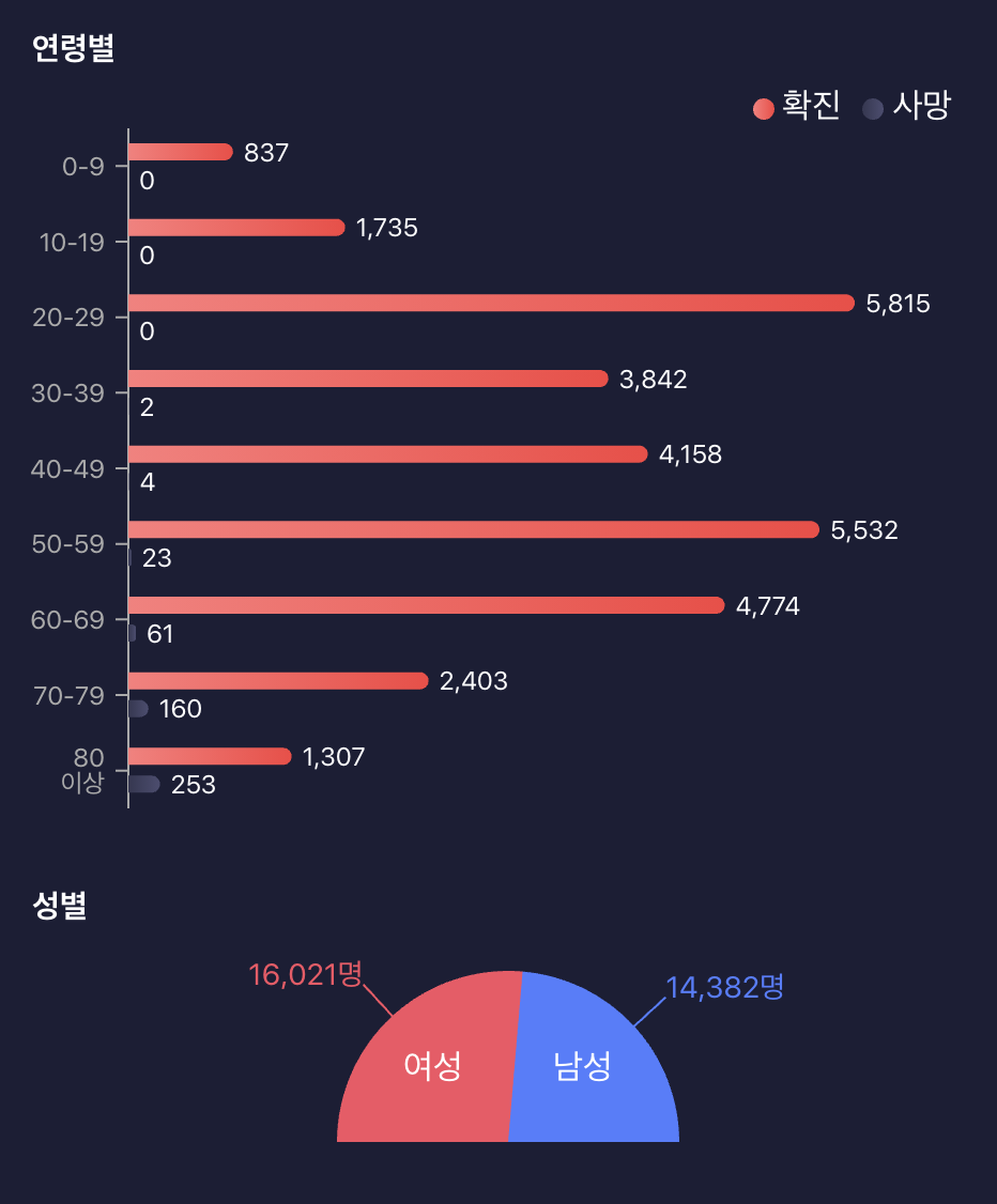 코로나 확진자 성별 비율은 여성이 남성보다 2000명 정도 높은 수치 이다.