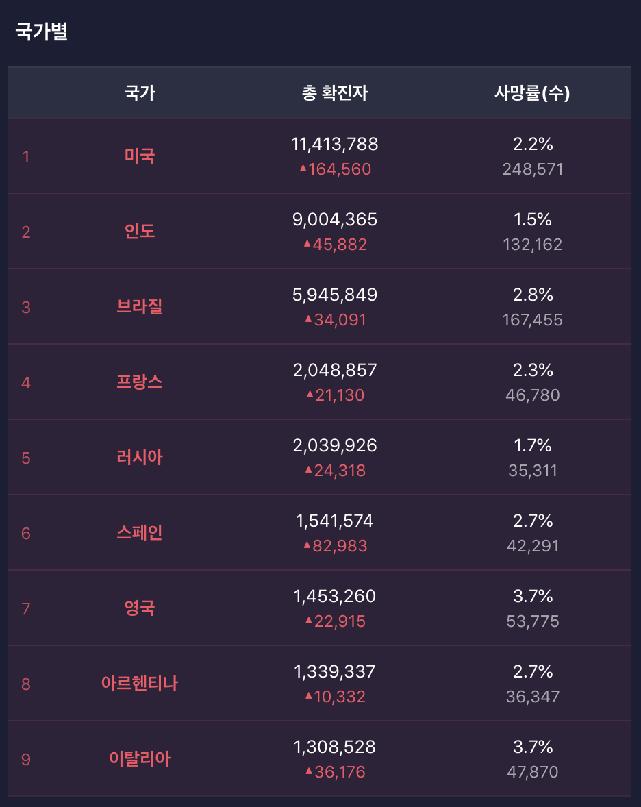 미국, 인도, 브라질, 프랑스, 러시아 순으로 총 확진자 수 가 높다.