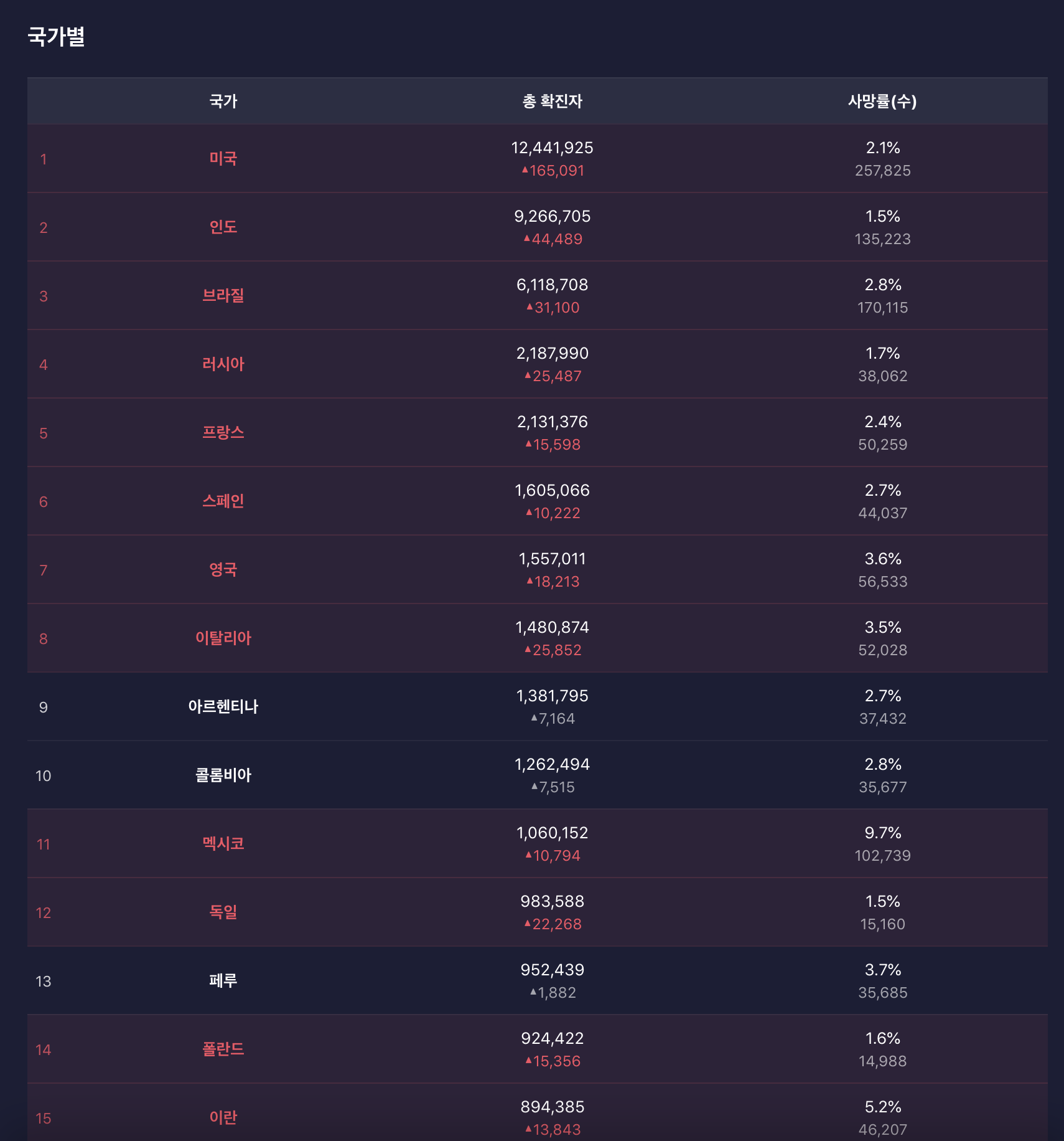 미국, 인도, 브라질, 러시아, 프랑스 순으로 확진자 수가 많다.